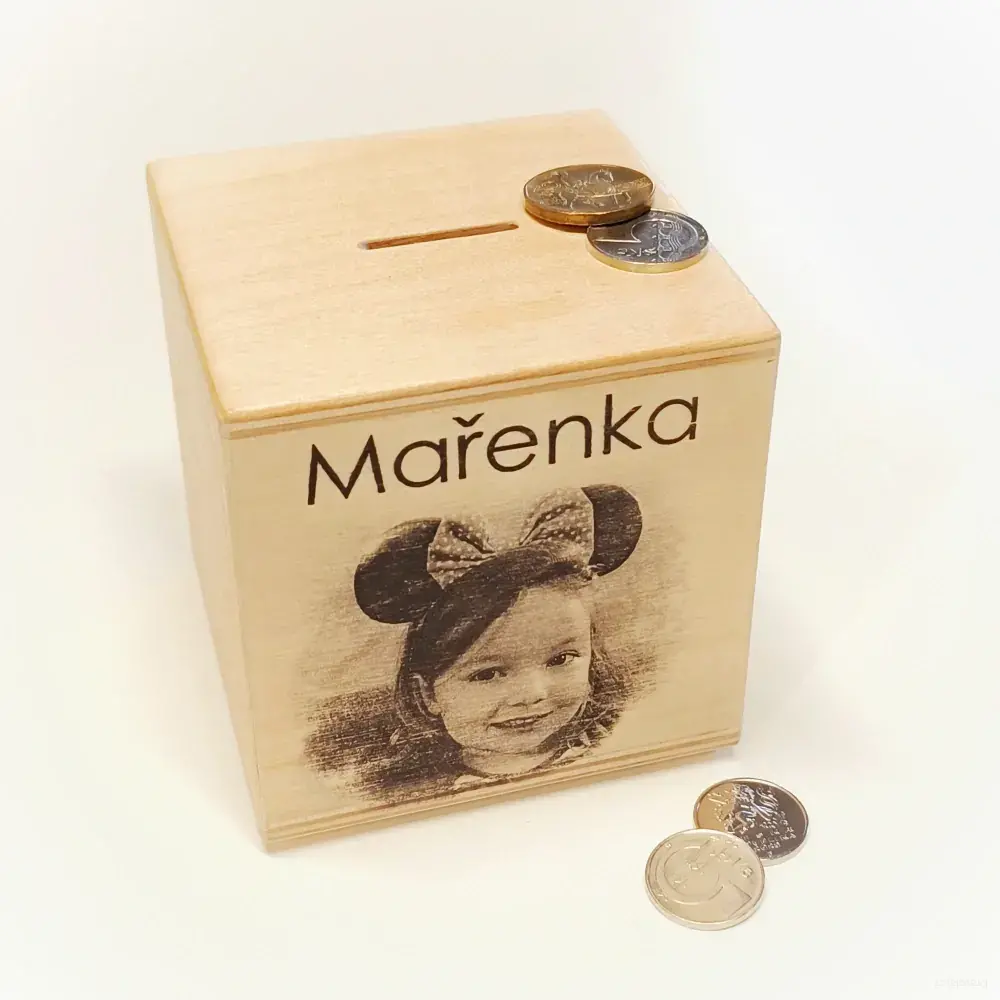 Dřevěná pokladnička s možností potisku. K penězům se dostanete až za použití šroubováku, tak vám tam snad chvíli vydrží a něco naspoříte:-)